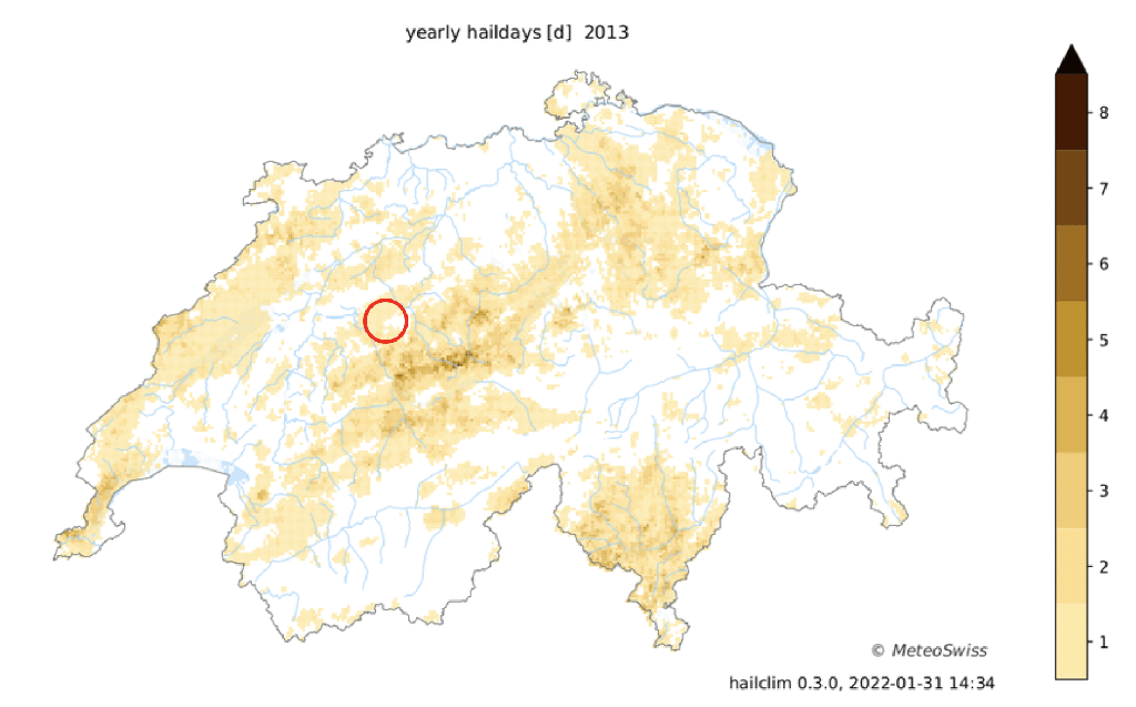 Arni BE, wo Bauer Peter Hofer lebt, ist an der Westflanke des Aaretals gelegen und grenzt an das Emmental. Ein Hotspot für Hagelgrossereignisse. Immer wieder gehen über Hofers Land Gewitter mit Hagel nieder. In den letzten 10 Jahren blieb der Grossraum Arni/Biglen (roter Kreis) nur 2019 Hagelfrei.