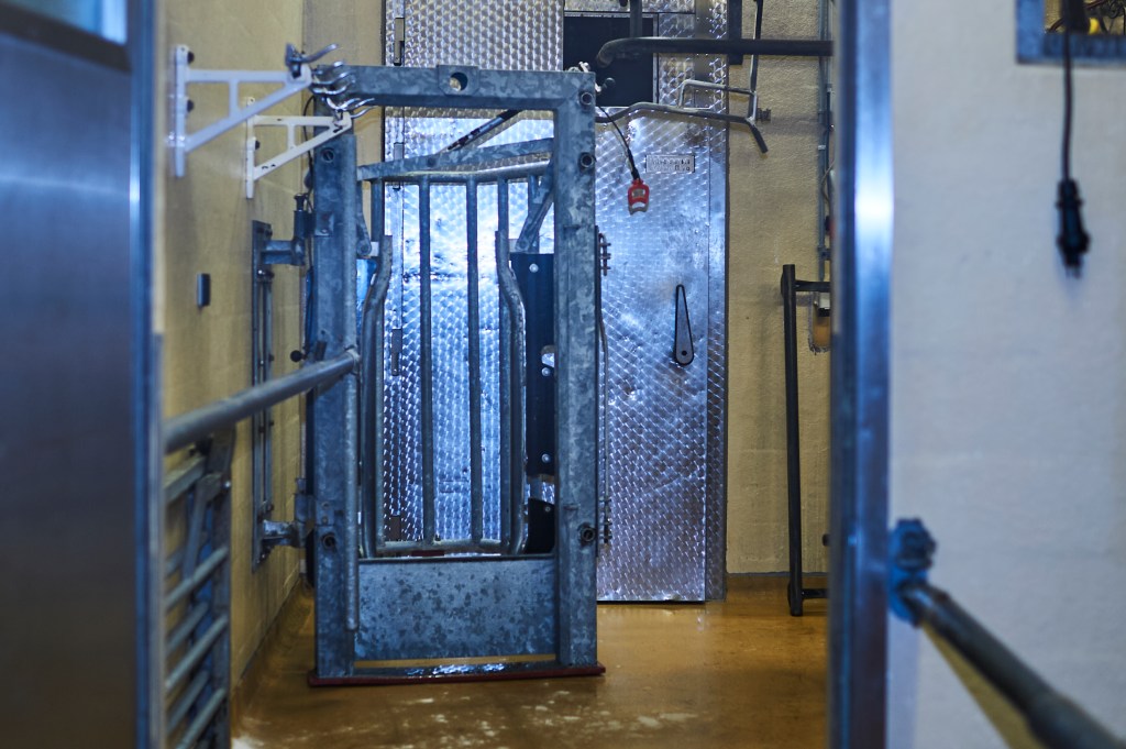 Der Ochse muss einen Korridor betreten. Der führt ihn zu einer Halterung, in der er befestigt wird, bevor der Metzger zur Tat schreitet. Die Halterung erinnert an das Gestell über einer Krüpfe, durch die die Tiere ihre Köpfe tagtäglich stecken, um zu fressen. Oder an eine Guillotine. Er schnaubt, zögert.