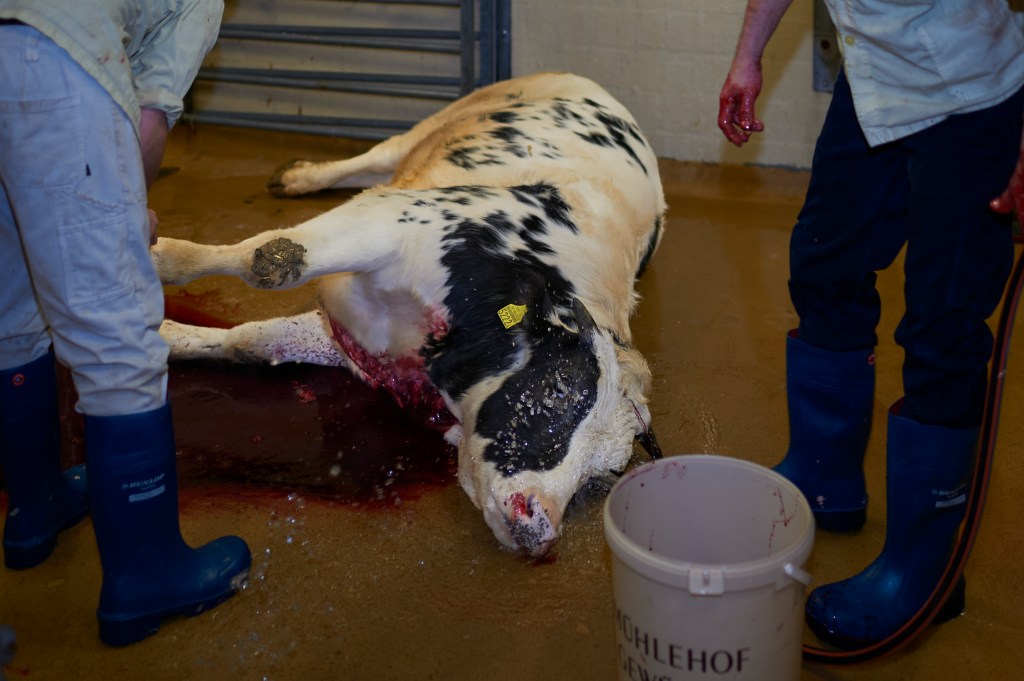 Unmittelbar nach dem Bolzenschuss drehen die Metzger das Tier, sodass das Blut abfliessen kann. Denn der erste Metzger schneidet dem betäubten Ochsen die Hauptschlagader durch, damit der Tod eintritt. Ein Schwall von Blut ergiesst sich aus der offenen Wunde. Als würde man einen Kessel ausleeren. Dunkelrot und opak bedeckt es den Boden.
