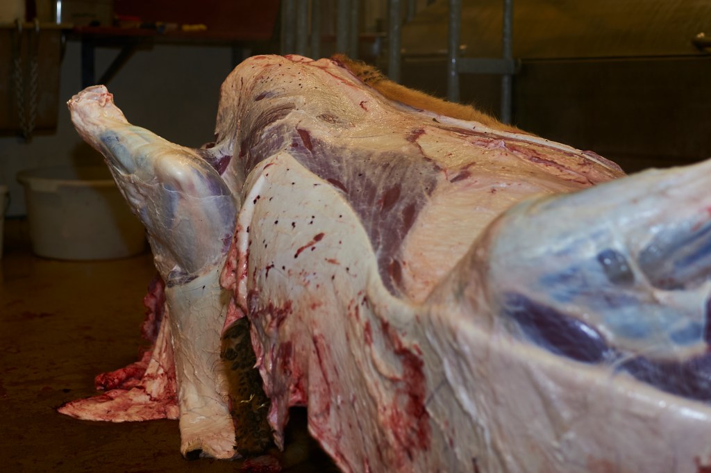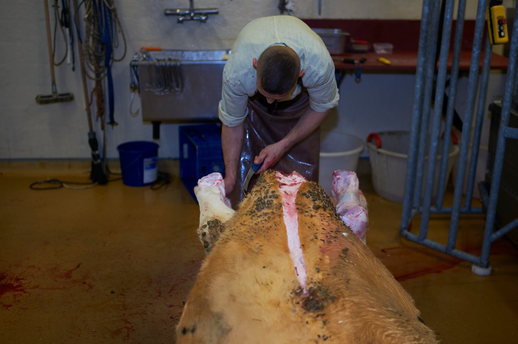 Der erste Metzger schneidet dem Ochsen den Kopf ab. Das Messer gleitet fast widerstandslos durch den Hals. Der zweite Metzger betätigt die Seilwinde. Das Tier wird auf den Rücken gelegt. Die Luftröhre flappt auf den Boden, die Beine sacken ein und dann liegt das Tier still. Der erste Metzger trennt mit einem präzisen Schnitt die Haut am Bauch des Tiers auf und beginnt, sie abzulösen. Der Zweite bearbeitet den Kopf. Auch Backen und Zunge werden verwertet. Langsam wird das Tier zum Nahrungsmittel.