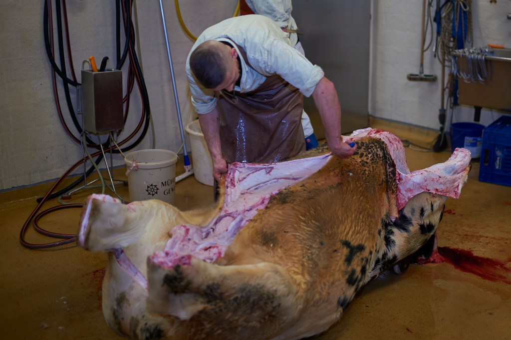 Inzwischen hat der zweite Metzger einen Schlauch so unter dem Hals des Tiers platziert, dass das Blut dem Abfluss zugeschwemmt wird. Der Ton ist jetzt leicht rosa. Wie Himbeersirup. Der erste Metzger schneidet dem Tier die Augen raus. Diesmal kein Blut. Der andere bindet den rechten Hinter- und den linken Vorderlauf an einer Seilwinde fest. Das Tier muss bewegt werden. Die Handgriffe der beiden Metzger sitzen und die beiden sprechen kein Wort zueinander. Routinearbeit.